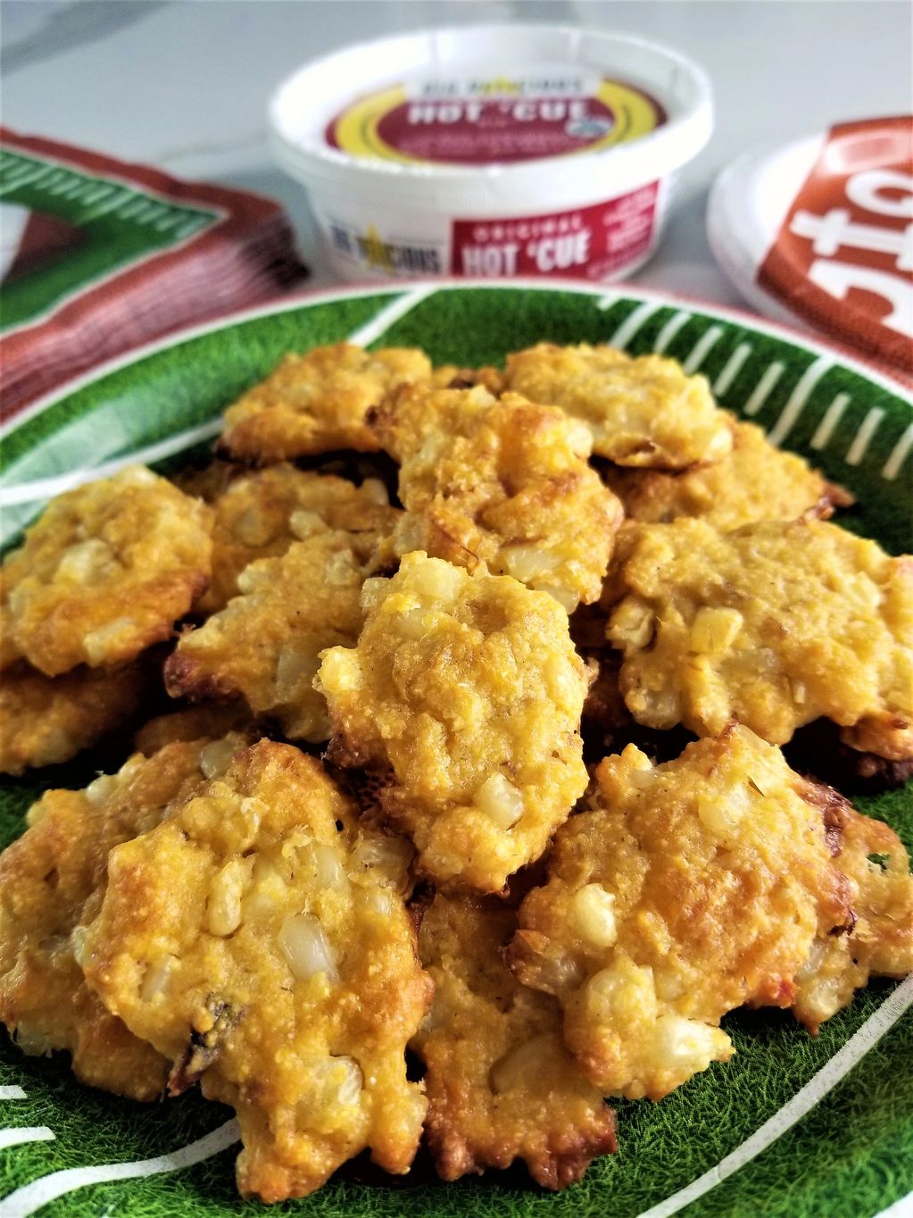 Folks, this is a tailgater's tasty dream! Combine equal parts Hot 'Cue Dip, corn muffin mix, and shredded cheddar before spooning onto a cookie sheet and baking at 350 for 10 minutes (or until golden brown). This is a delicious winner every time!