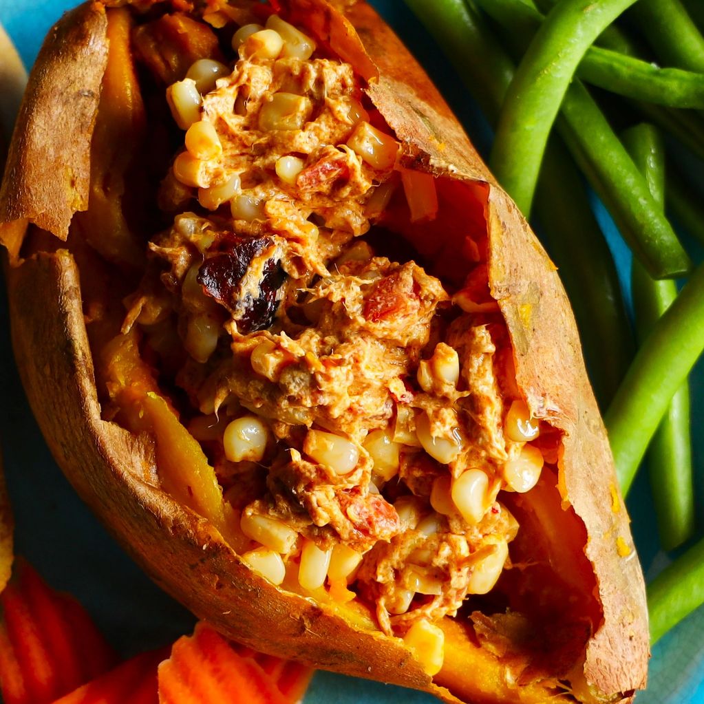 Dinner for one, anyone? Hearty and tasty, for sure, this delicacy needs no instructions. But just in case, here goes: cook your sweet potato (microwave or bake - your preference), warm your Original Hot 'Cue Dip and add it to the potato, then dig in!