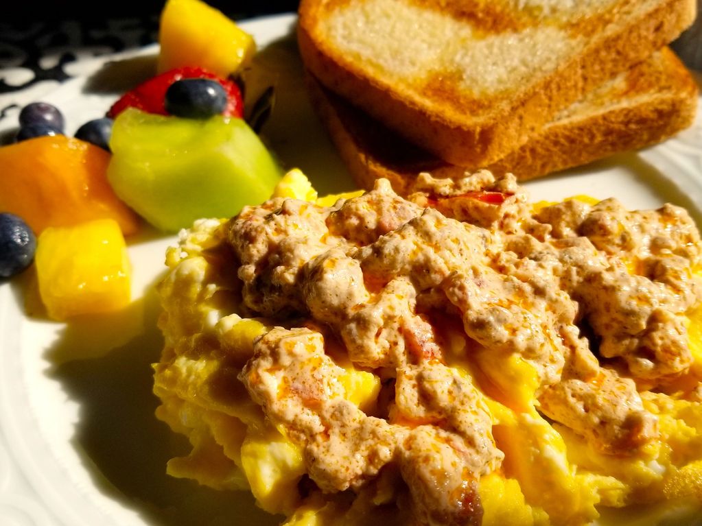 And they say we don't do breakfast. Whatever. This may be the simplest and tastiest of them all. Some like these scrambled in the pan together, and some just like their eggs covered, but either way, "they" all love it! (Even the newcomers.)